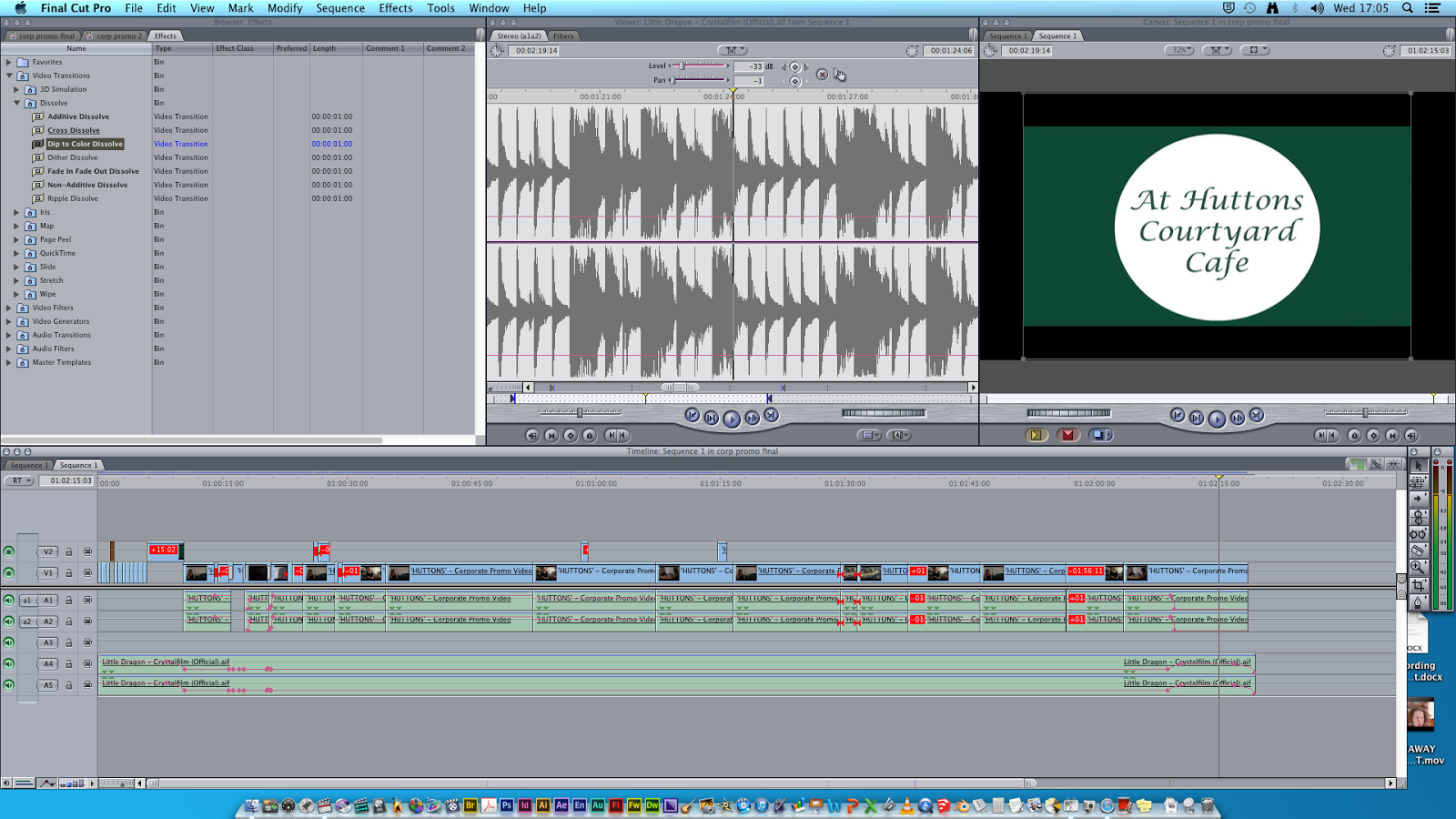 I imported the mov. into final cut and started by sorting out all my footage into individual clips by cutting the clips where I was them using the razor tool, selecting the footage in the viewer window and going to Modify > Make SubClip where I renamed each clip. I also added the backing track "Crystal Film" by Little Dragon, although this song is copyrighted, |I contacted my client and they weren't using it on their website so I didn't need to worry about copy right issued. I thought the song flowed a lot better and the start was more eye catchy and professional.
